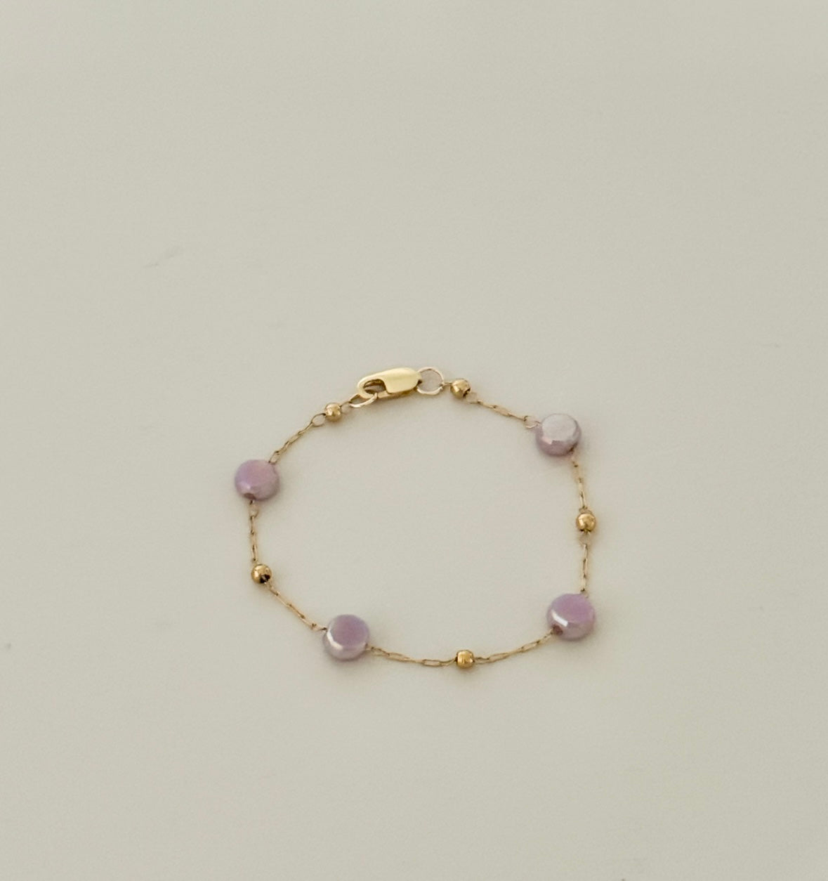 A dainty, dreamy bracelet made with soft lavender beads and 14k gold-filled accents — designed to be gentle on little wrists and perfect for everyday wear. Handcrafted with love in our family studio.