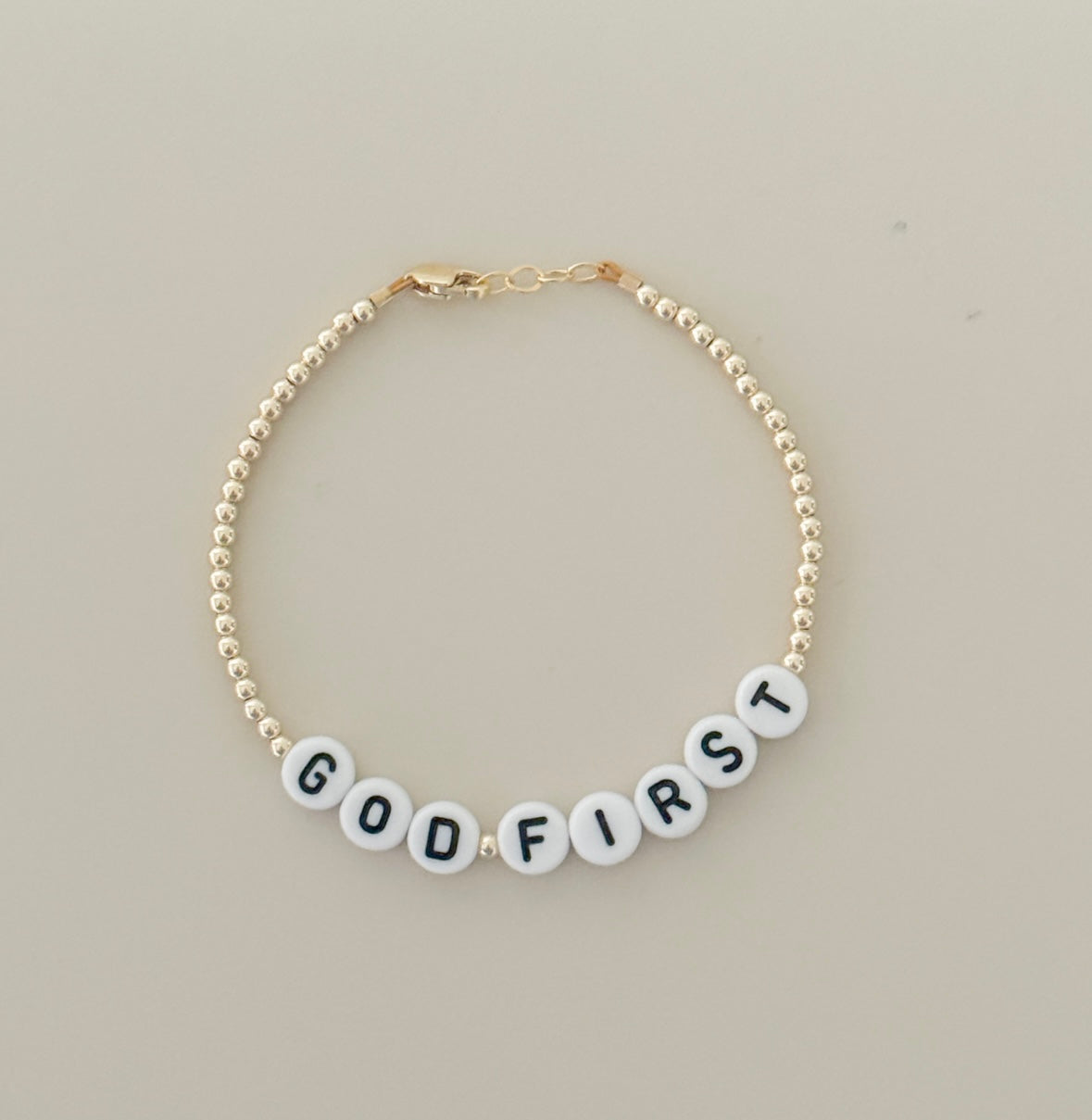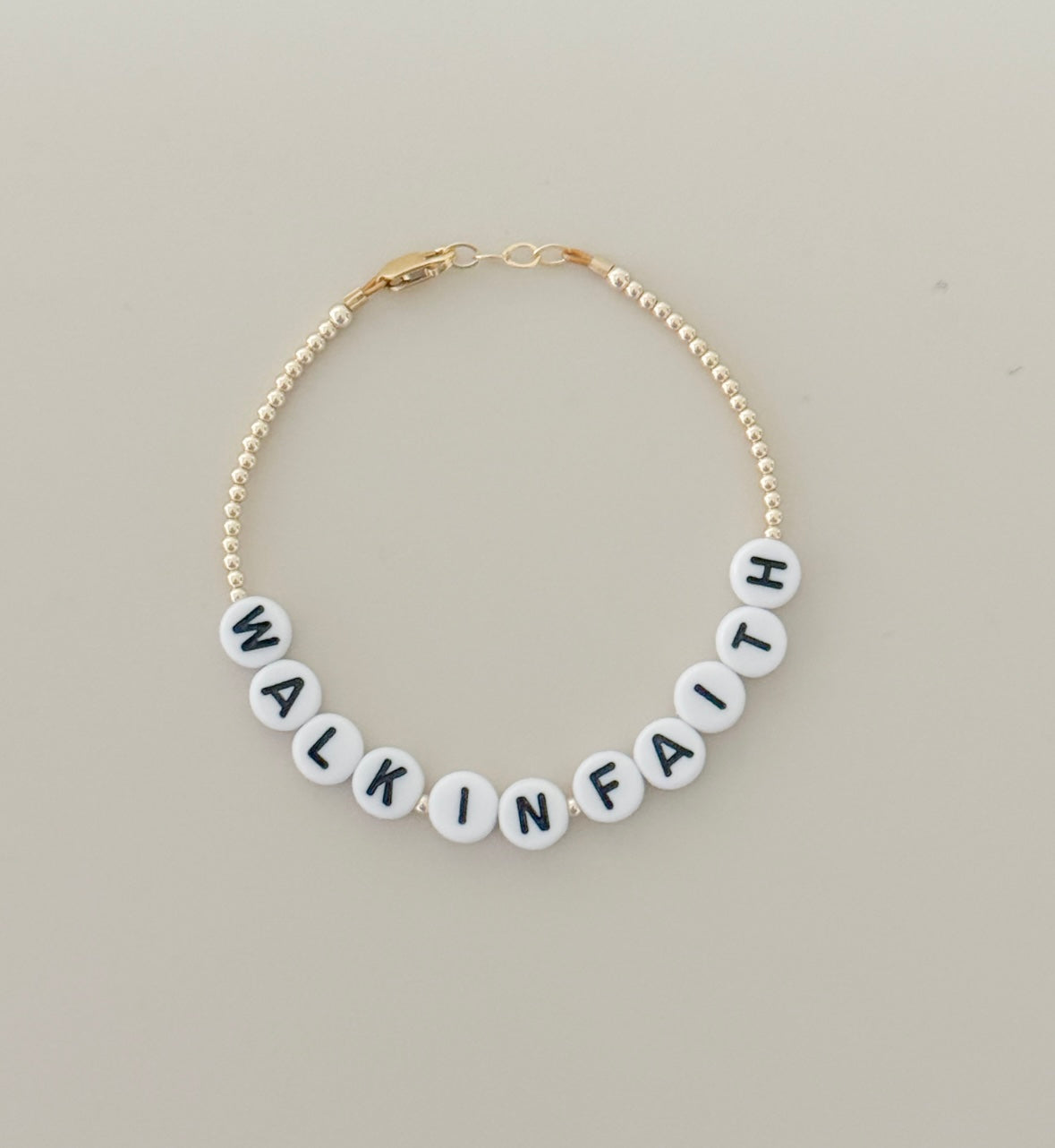 Each piece is made with white acrylic letter beads and 14k gold-filled accents — durable, hypoallergenic, and safe for everyday wear. Stack them, gift them, or wear them as your daily reminder to lead with love and walk by faith.
