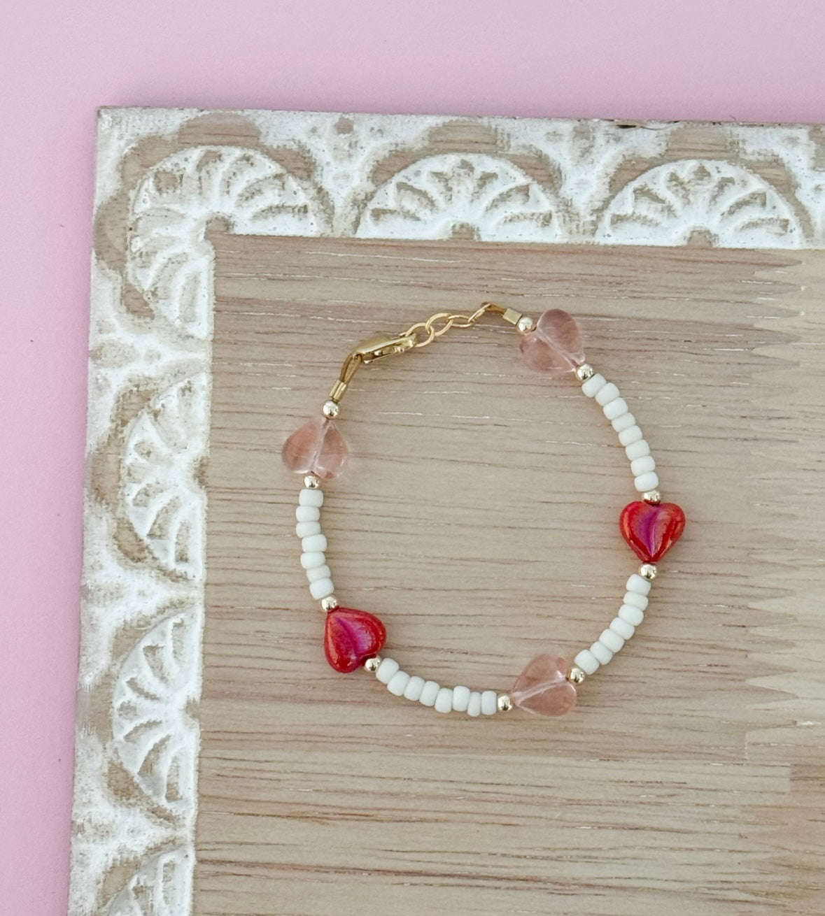This handmade heart bracelet features delicate pink and red heart beads, soft white seed beads, and 14k gold-filled accents for a timeless, meaningful design. Perfect for babies, toddlers, girls, and mom-and-me matching moments, each bracelet is thoughtfully created to be both beautiful and comfortable for everyday wear.
