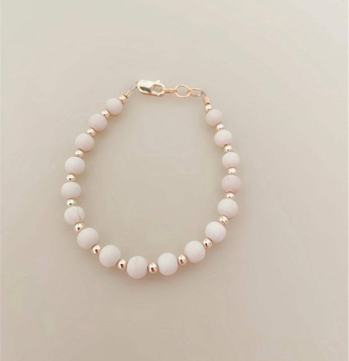 I adore the neutral tones of this beautiful bracelet! It features 4mm stone beads and 2mm gold-filled beads in between. The combination of these materials creates a versatile piece that layers perfectly with soft pinks, creams, golds, and whites in the shop.