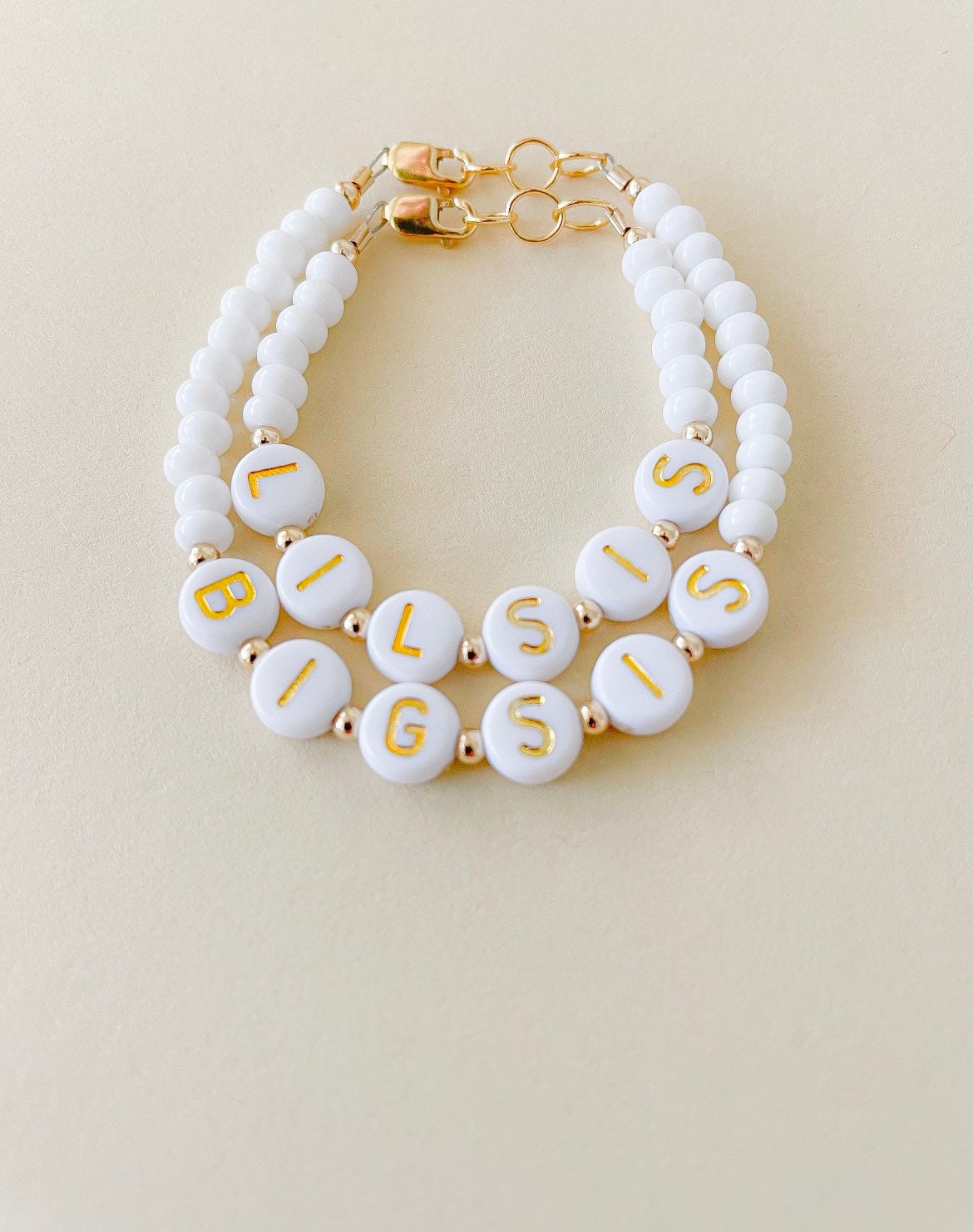 Each bracelet is handcrafted with 7mm white and gold letter beads and 14k gold-filled metals, designed to be hypoallergenic, waterproof, and tarnish-free for lasting everyday wear.